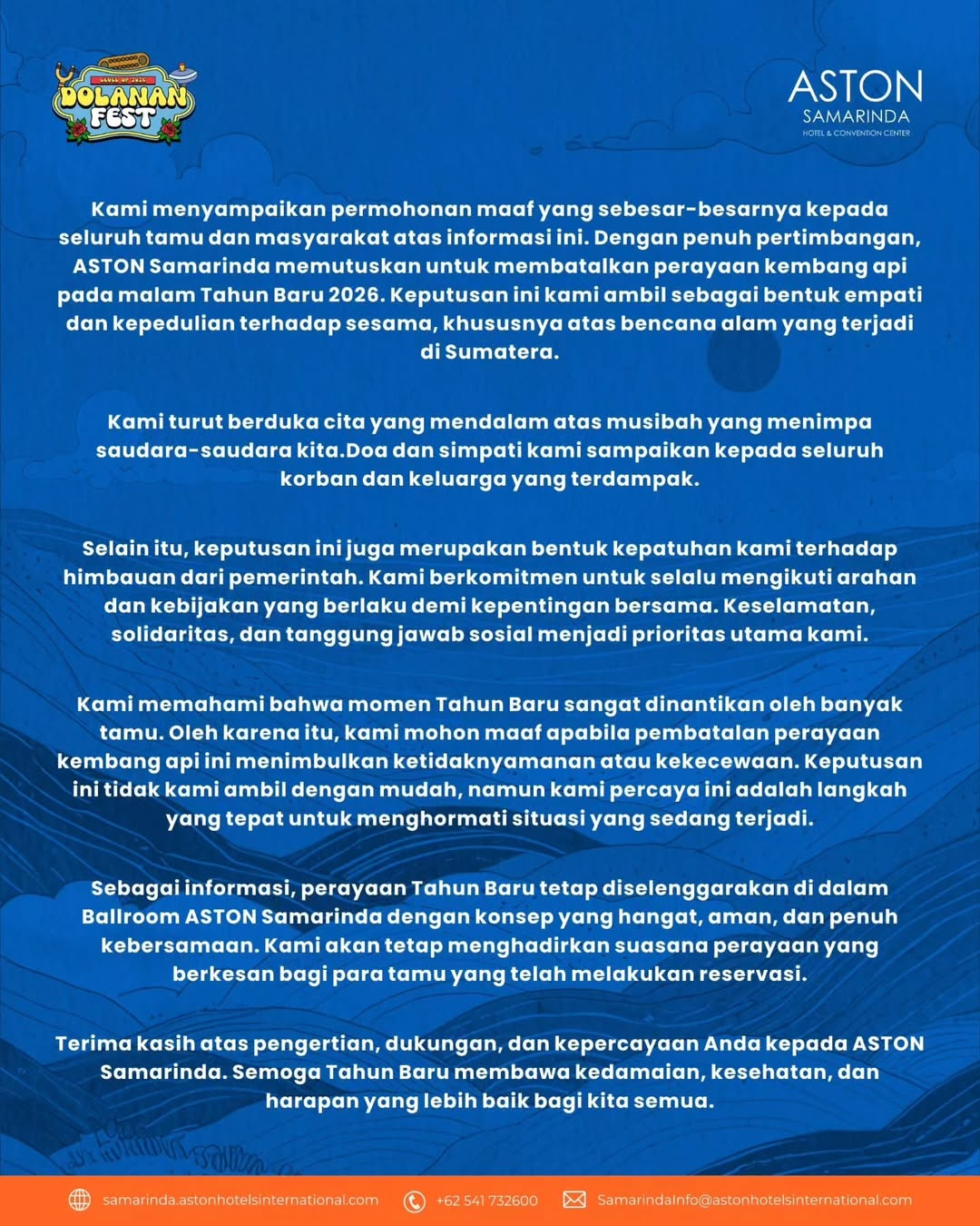 KALTIMWARA.COM - SAMARINDA - Manajemen ASTON Samarinda Hotel & Convention Center secara resmi mengumumkan pembatalan atraksi kembang api yang sedianya menjadi puncak perayaan malam pergantian tahun 2026. Keputusan ini diambil sebagai bentuk solidaritas dan empati mendalam terhadap musibah bencana alam yang saat ini tengah menimpa wilayah Sumatera.